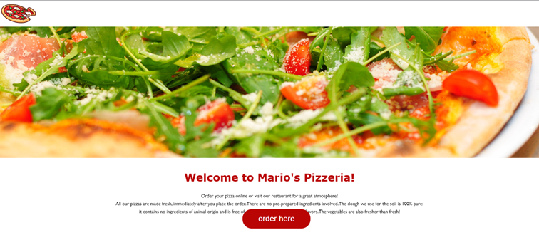 This is our homepage. As you can see the button placement isn’t on the right place but that doesn’t matter: what’s important is the pizza. We also thought it was fun to have a small pizza as the logo. After clicking on the button you will be redirected to the menu. If you click on the button ‘add’, the flask file will make a .txt file with the added orders. If you scroll done you will see a ‘confirm order’ screen.